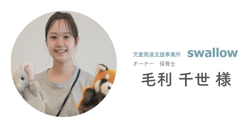 swallowでは、短時間利用のお子さまが多く、習い事のように大人数で過ごす時間と、1対1でじっくり向き合う時間の両方を大切にしています。また本当に悩むところにアプローチしたいとも考えています。困っていないところまで支援してしまわないよう、一人ひとりをしっかり見て、その子に合った支援を心がけています。」